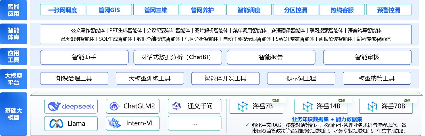 东营“城市大脑”智慧水务平台以供水全链路高质量数据集为支撑,依托浪潮海岳智能体平台,结合判别式AI与生成式AI“双引擎”技术,整合供水生产、管网运行、用户用水等多维度数据,构建起“大模型基座-垂域大模型-通用及水务专业智能体应用”智能应用体系,让智能体精准理解业务场景,助力城市级水务集团、区域供水公司解决关键场景难题,推动行业绿色低碳转型。其中,数据治理提升、智能调度、供水量预测、ChatBI智能问数、大用户预警等功能已广泛应用,显著提升了水务行业智能化水平与管理效率。