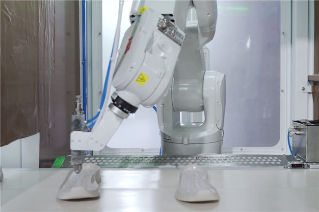 福建云企智造科技有限公司董事长白凯分享了福建云企核心业务,他表示,作为智能制造领域的探索者,福建云企致力于为行业提供“AI+机器人+物联网”三位一体解决方案,为企业的复杂多场景打造自动化和智能化应用。围绕鞋服产业的实际需求,福建云企推出的刷胶机器人工作站基于3D视觉识别技术,能够实时采集鞋底视觉数据,并通过AI算法建立鞋底数字模型,同时自主生成喷胶工艺轨迹,最终由机器人完成无人化鞋底喷胶流程。刷胶机器人工作站能够轻松应对各种复杂曲面工件,准确率超99%,并有效减少涂料飞溅与过度喷涂,从源头降低材料消耗与挥发性有机物排放;在保证涂层均匀度的同时,单台设备等效2名人工,实现了环保效益、职业健康与生产效能的多维共赢。