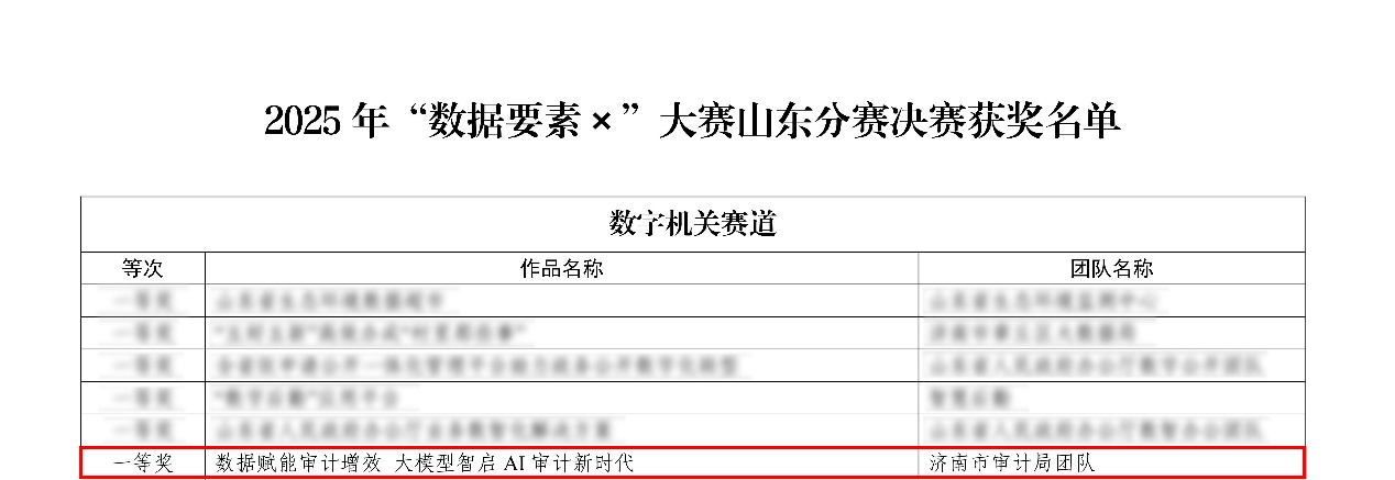 近日,由国家数据局、山东省人民政府指导,省大数据局等联合主办的2025年“数据要素×”大赛山东分赛决赛获奖名单正式公布。浪潮云联合济南市审计局打造的《数据赋能审计增效 大模型智启AI审计新时代》解决方案在645个作品中脱颖而出,荣获数字机关赛道一等奖。
