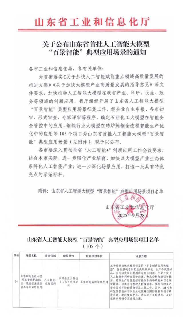近日,山东省工业和信息化厅公布了山东省首批人工智能大模型“百景智能”典型应用场景名单,浪潮企业云打造的“生物医药大模型相关应用场景”成功入选。