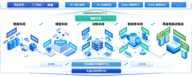 为破解这些瓶颈,浪潮卓数大数据对自研“模数工坊”产品体系进行了全面战略升级——以“DATA+AI”双能力建设为主线,聚焦数据价值挖掘与AI能力生产两大核心场景,构建包含数据车间、训练车间、模型车间和智能体车间、具身智能训练场五大功能模块的全链条闭环生产体系,贯穿从上游数据供给到下游模型应用与服务全链条,推动多维数据价值倍增和千行百业智能升级。目前,“模数工坊”已在数字政务、金融服务、商贸流通等多个领域实现落地应用,深度赋能“数据要素×”与“人工智能+”。