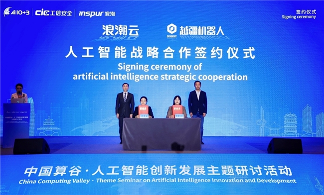 会议期间,浪潮云与越疆机器人在会上签署人工智能战略合作协议,双方将发挥各自优势加强技术生态联合,加速具身智能技术创新,共同拓展人工智能技术在多场景的应用落地,以生态合作模式助推未来产业融合发展。