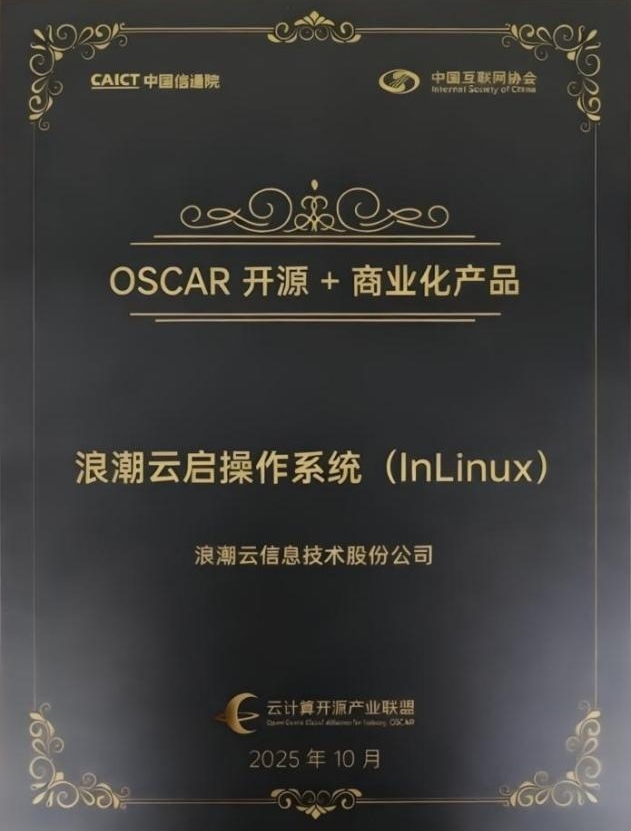 近日,由中国通信标准化协会主办的2025 OSCAR开源产业大会在北京举行,会上,浪潮云启操作系统(InLinux)凭借开源技术创新成果与商业化落地卓越表现,成功荣获“OSCAR开源+商业化产品”奖项,展现了浪潮云在“AI Forward”引领下的开源创新力量。