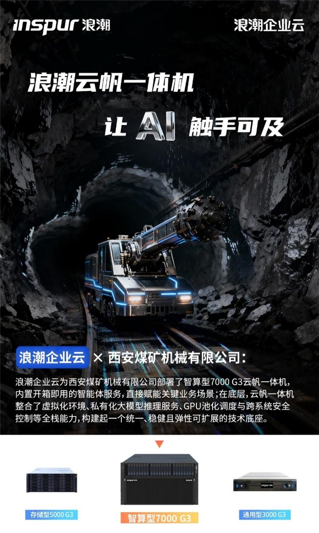 当积淀了七十余年重工业记忆的西煤机,与致力于产业智变的浪潮企业云相遇,一场“硬核制造”与“云端智慧”的融合就此展开。在“人工智能+”行动的指引下,西安煤矿机械有限公司(以下简称:西煤机)引入浪潮企业云打造的云帆一体机,将厚重的制造积淀淬炼为面向未来的智能装备,推动自身从“地层深处”向“云上高地”的华丽转身。