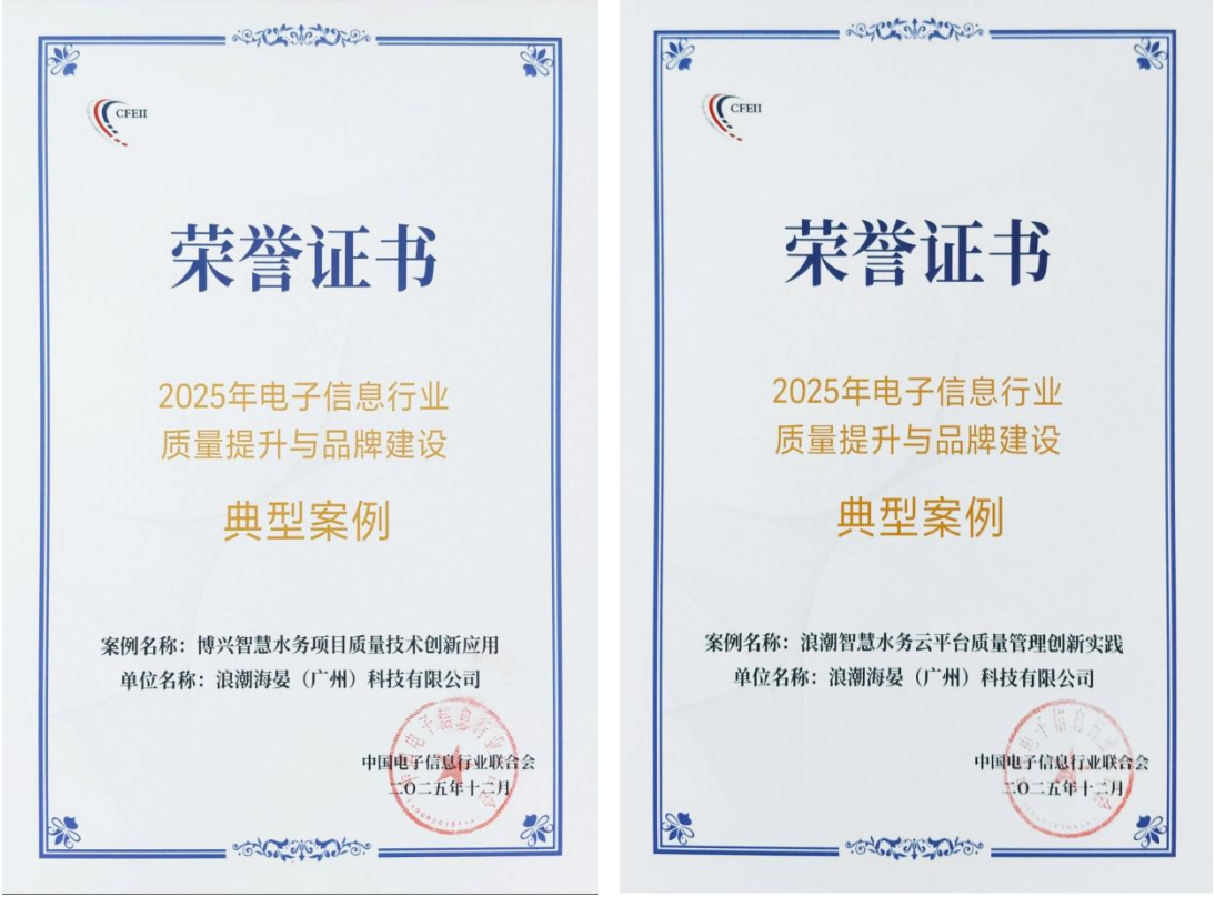 2025年电子信息行业质量提升与品牌建设典型案例遴选由中国电子信息行业联合会发起,旨在落实国家质量提升战略部署、推动质量技术创新应用、提升产品可靠性水平,及时发现、总结、推广一批示范性强的质量管理先进经验。浪潮海晏提报的“浪潮智慧水务云平台质量管理创新实践”和“博兴智慧水务项目质量技术创新应用”两项案例成功入选,充分体现了在质量创新与实践方面的示范意义与引领作用。
