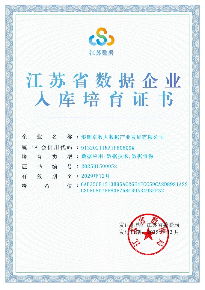 近日,江苏省数据局正式公布2025年首批入库培育数据企业名单,浪潮卓数大数据凭借在数据要素领域的扎实积累和综合竞争力成功入选,一并取得数据资源、数据技术、数据应用三类培育资质,成为江苏省培育壮大数据产业生态的重要力量。
