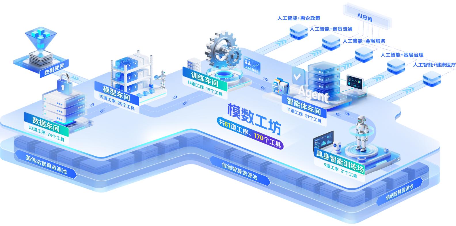 “数据车间”以标准化数据采集、清洗、标注和检测流程,为AI训练提供高质量、可追溯的数据燃料;“模型车间”汇聚开源、闭源及行业专用模型资源,形成覆盖模型全生命周期的安全管理体系;“训练车间”建立从数据输入到模型部署的全工序流水线,推动AI产品的标准化生产;“智能体车间”通过低代码、模块化开发环境,降低技术使用门槛;“具身智能训练场”实现软硬一体化融合,将算法能力精准注入硬件设备,推动智能产品的规模化部署。