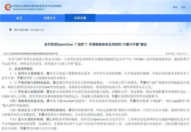 针对“龙虾”典型应用场景下的安全风险,工业和信息化部网络安全威胁和漏洞信息共享平台(NVDB)正式发布关于防范OpenClaw(“龙虾”)开源智能体安全风险的“六要六不要”建议,为企业和个人安全使用OpenClaw划定红线。